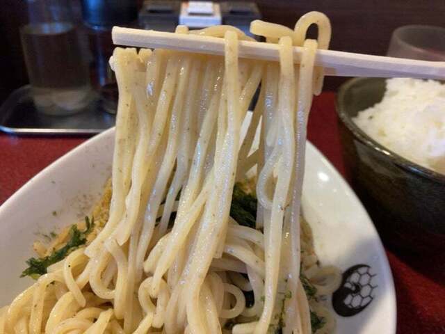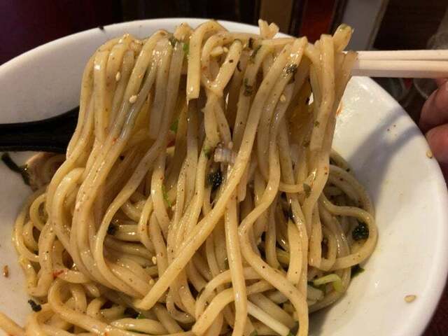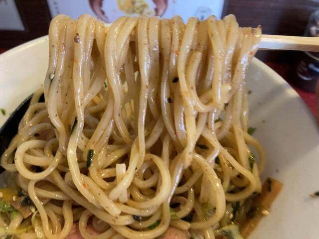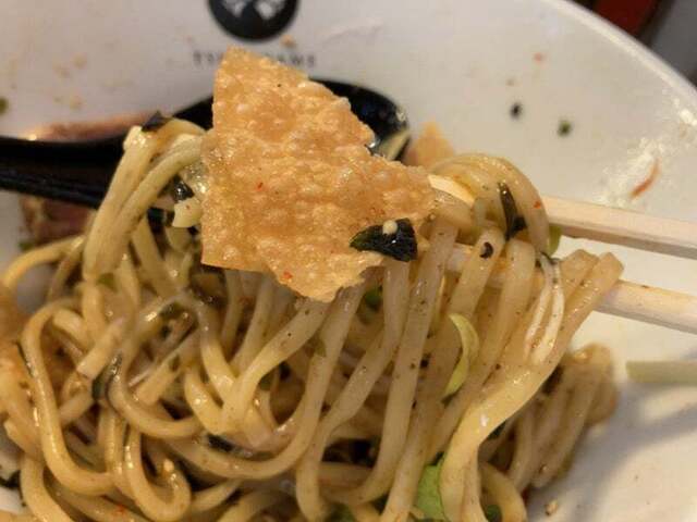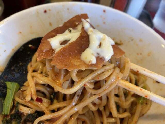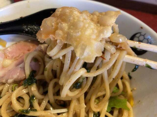 さらにマヨネーズがかけられた揚げ餃子皮を砕いて麺と一緒にいただくと、パリサク食感が麺と相性抜群で、そこにマヨネーズの程よい甘みと酸味が加わって、めっちゃまいう~!