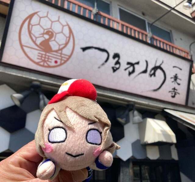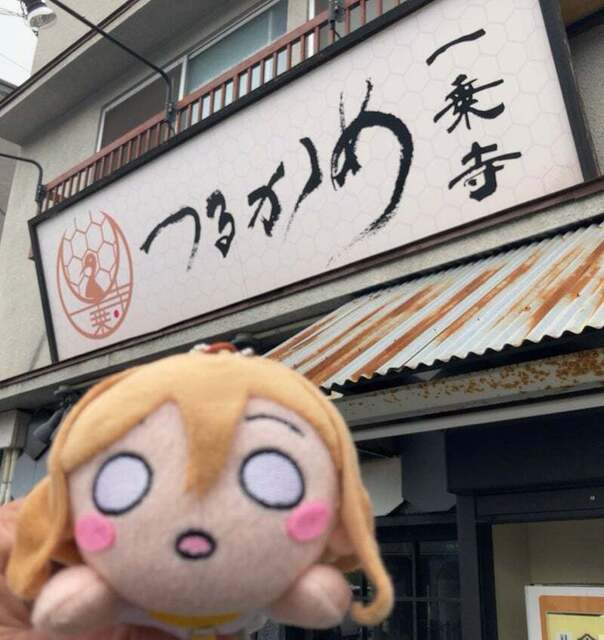今日のお昼は、午前中の会議が長引きちょっと出遅れましたが、チビヨハちゃんに乗って、京都ラーメンの聖地“一乗寺”にある人気店「つるかめ一乗寺」へ、梨子ちゃん@Aqoursの寝そべりぬいぐるみとともにやってきました。