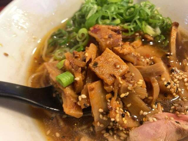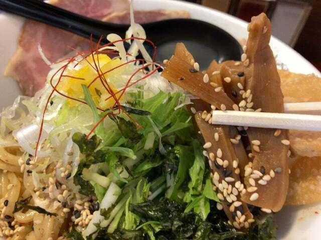 しっかり味付けされたメンマのコリコリ食感、刻み水菜のシャキシャキ食感、笹切り白ネギのザクザク食感がアクセントになって、めっちゃイイ感じ!