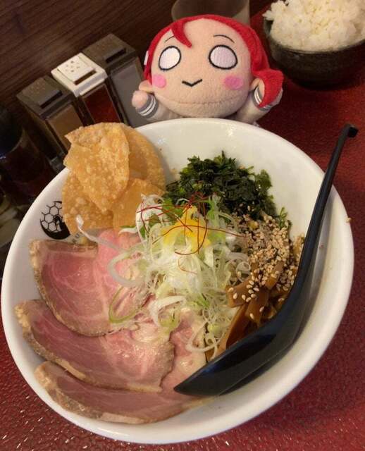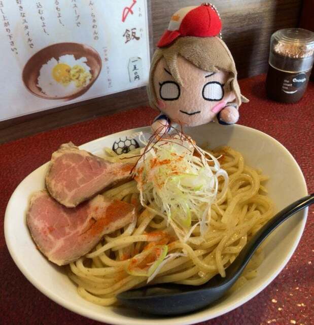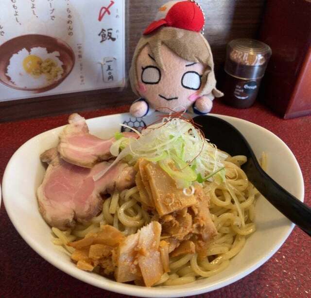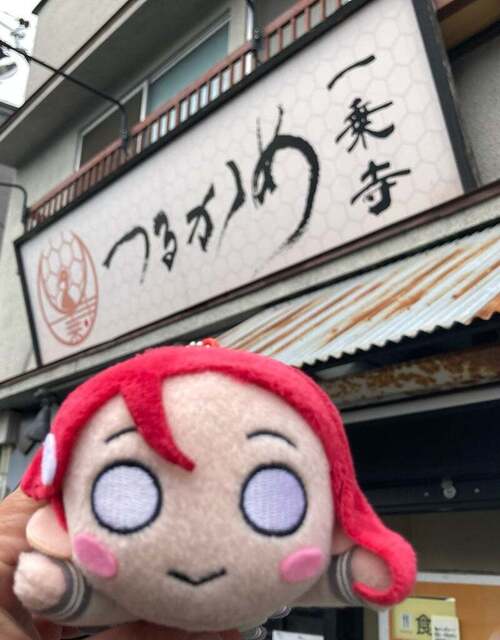 今日のお昼はヒンヤリンコで冷たいのん!三兄弟!がまだ販売されていることを期待してチビヨハちゃんに乗って、京都ラーメンの聖地“一乗寺”にある人気店「つるかめ一乗寺」へ、ルビィちゃん@Aqoursの寝そべりぬいぐるみとともにやってきました。