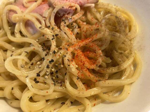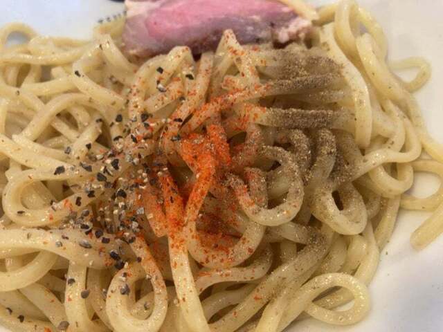 途中で、卓上の一味唐辛子、ブラックペッパー、山椒を麺にふりかけてからつけ汁に投入すると、それぞれの持つ風味が麺の風味を引き立てて、味変大成功~!