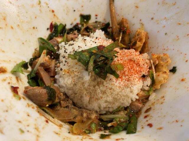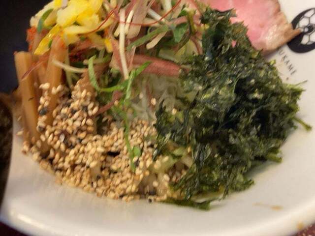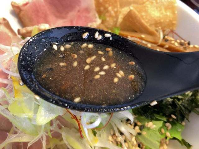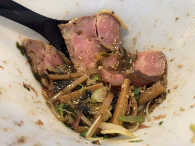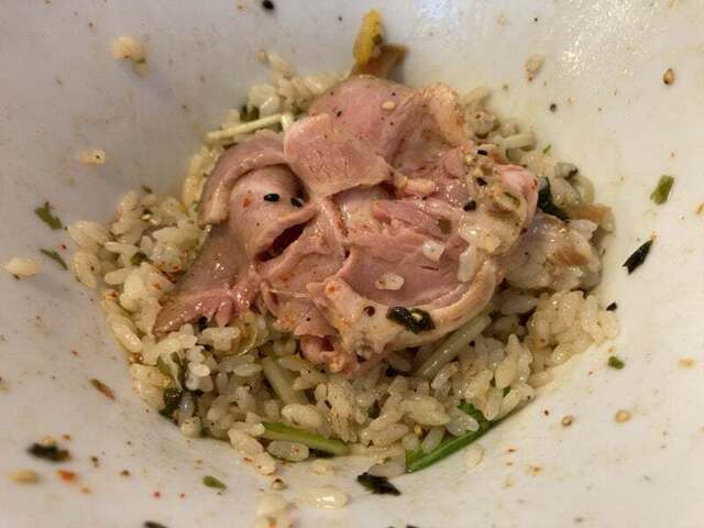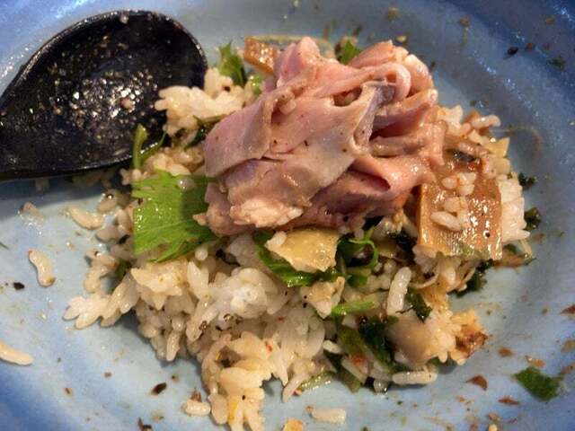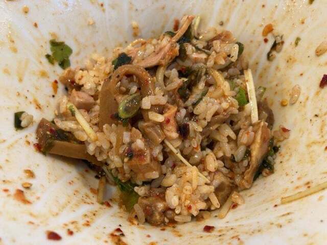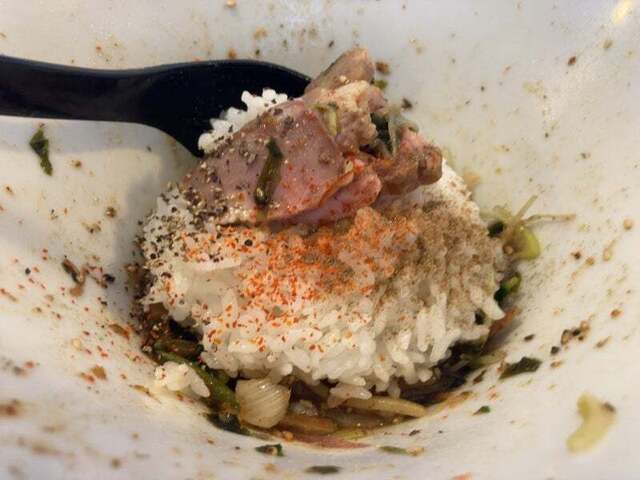 そして、ライスの量を食べて調整した後、最後の〆は、残った醤油ダレとトッピング類めがけてのぉ~