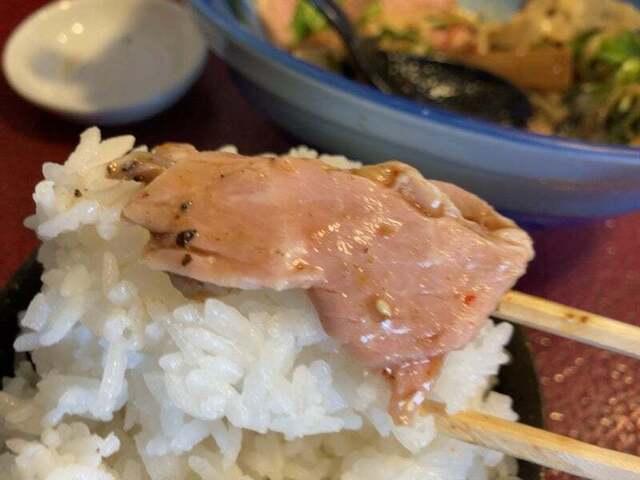 ここで最後の儀式のために、チャーシュー、メンマ、ニラ唐辛子などをおかずにして、プチマンガ盛りの銀シャリご飯(大)の牙城を崩しておきます。