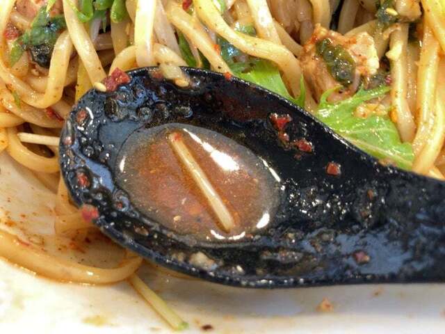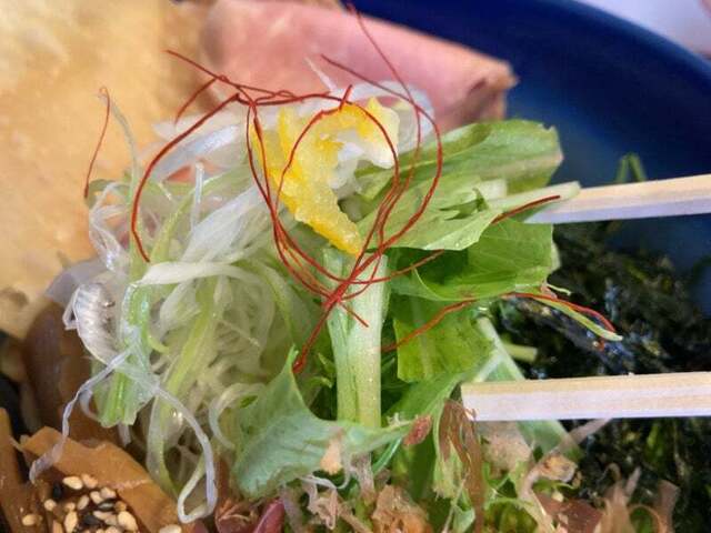 さらに笹切り白ネギのシャキシャキ食感、糸唐辛子の風味と辛みがアクセントになって、めっちゃイイ感じ!