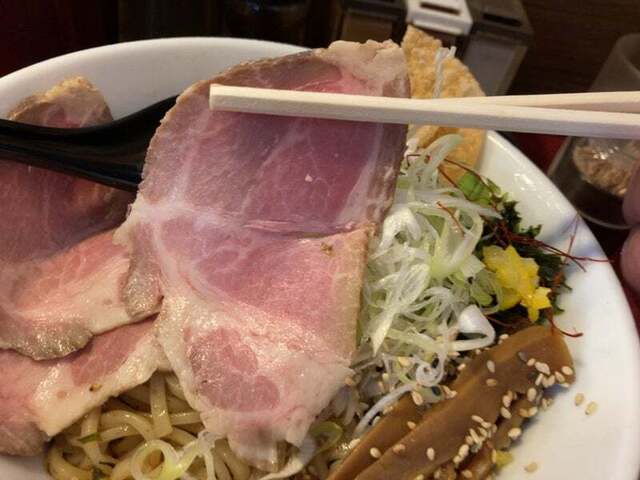 短冊状とサイコロ状の豚ロースチャーシューは、噛み応えがあってしっとり食感が心地よく、噛めば噛むほど肉の旨みが口の中にいっぱいに溢れ出し、魚介醤油ダレとしっかり絡んで、めっちゃウマウマ~!