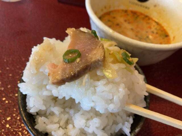 さっそく一口いただいてみると、ヒンヤリンコな担々つけ汁と節系魚介出汁の風味と旨みをたっぷりと纏ったライスに、肉の旨み、味変調味料の風味が加わって、超絶やばウマ~!