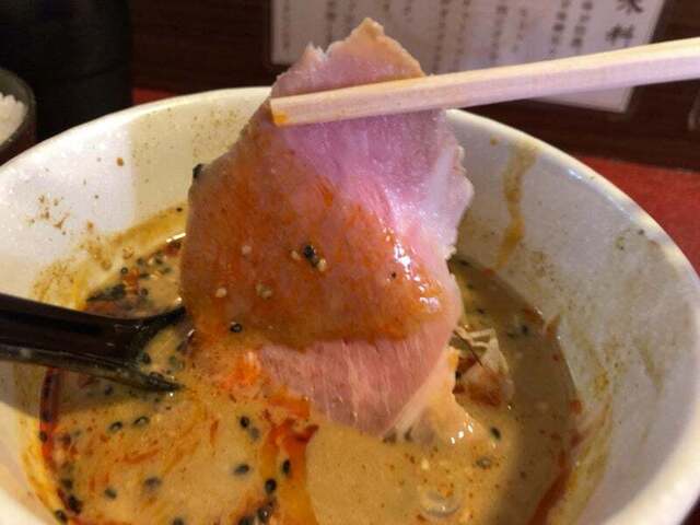 豚ロースチャーシューはしっとり食感が心地よく、噛み応え十分で、噛めば噛むほど肉の旨みが口の中いっぱいに溢れ出し、カレー担々つけ汁にしっかり絡めていただくと、めっちゃウマウマ~!