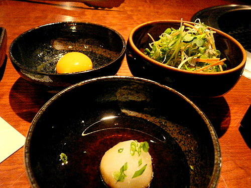 次のお肉の前に用意されたのはポン酢、生野菜、卵黄。
