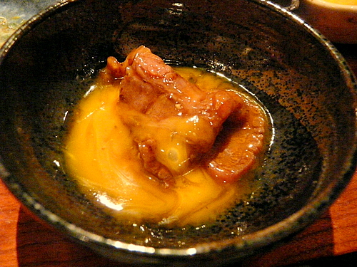 甘み強めの濃厚な方のタレに「ジャブ漬け」して卵黄に絡め頂きます。