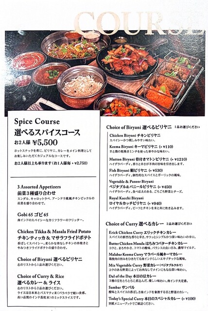 写真にある、選べるスパイスコース(2名〜)を注文。値段は単品頼むよりもそりゃ高くなるけど、いろいろ食べれて絶対おすすめ。