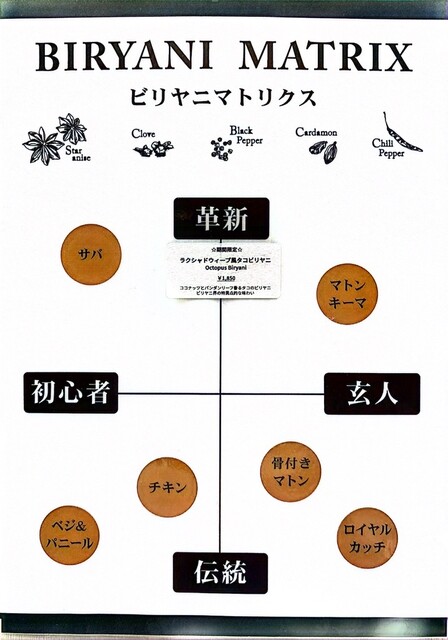 写真にあげてあるけど、当店のビリヤニマトリクスによれば、今日食べたチキンは初心者且つ伝統という王道チョイス。