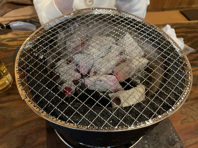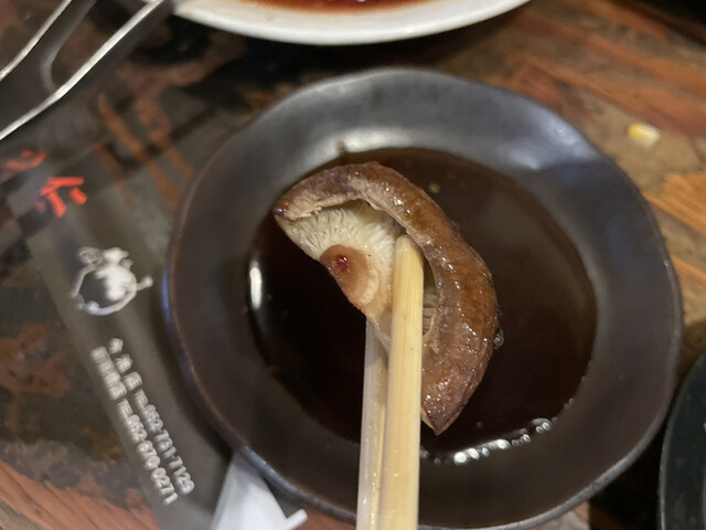 大きめな椎茸を真っ二つにしたものが全部で8切れ運ばれてきます。椎茸は肉厚でタレが振られていて、傘の外側を下向きにして焼きました。傘の内側に汗が出て来たら食べ頃。椎茸の旨味がギュッと詰まっていて、表面の焦げの芳ばしさや苦味とともに美味しく頂けます。