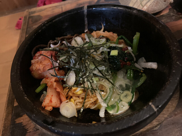 石焼きビビンバは大きめで厚手の石の器に入れられて運ばれて来ますので、到着後、具材をかき混ぜて器の内側にペッタリと貼り付け、お焦げを作ります。熱々の器のお陰で、パリパリで芳ばしいお焦げがたっぷりと出来ます。具材も盛り沢山で、ほうれん草、キムチ、ナムル、海苔、卵、ご飯もしっかり。