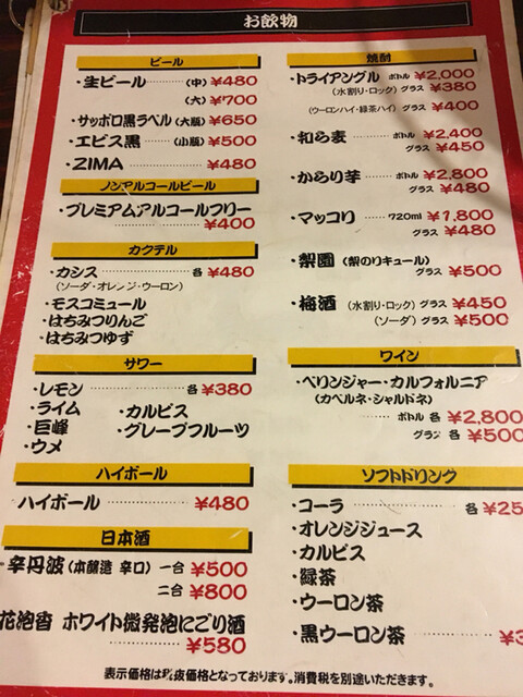 祝日の17時過ぎに夕飯目当てで訪問。店内は3割ぐらいの入りで予約無しでも入店することが出来ました(奇跡!)。テーブル席へ着席してから注文したメニューは注文概要の通りです。
