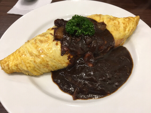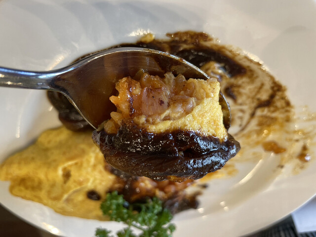 たっぷりのデミグラスソースがかかった特製オムライス。中身はチキンライスなのですが、なんといっても大きなホタテとエビが入っているのが特徴です。大きなホタテはもっちりと表現していいのか、肉厚で濃厚。大きめなエビも独特の食感を楽しめます。また、両者から滲み出ているであろう出汁もオムライスの風味を増し、益々美味しくなっています。