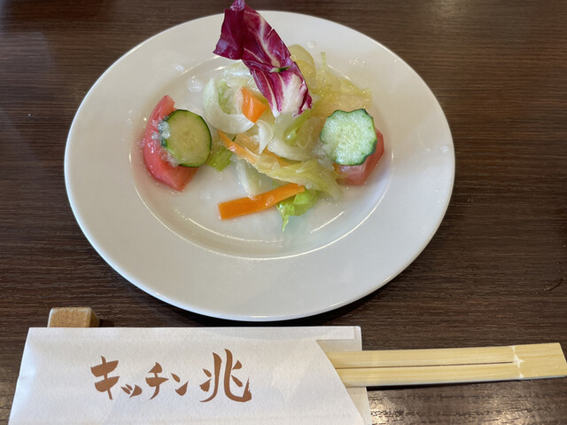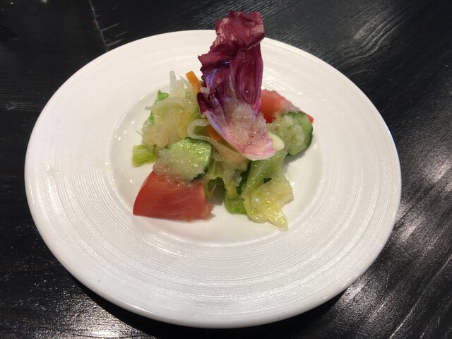 最初に運ばれてきたのが、キャベツのマリネ。土台はレタス、マリネはキャベツ、玉ねぎ、人参で甘酸っぱく味付けがされています。味は爽やかの一言です。夏でも酸味が食欲をそそり、美味しく頂けます。キャベツはシンナリ、レタスはシャキシャキで食感の違いがいい。