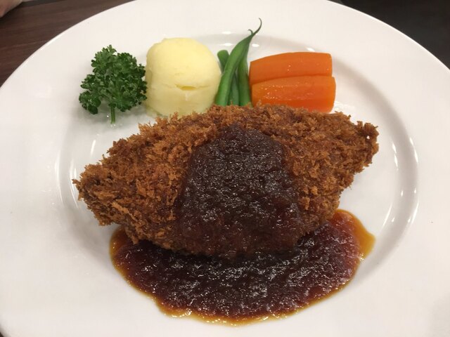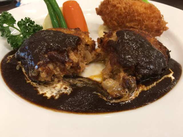 ハンバーグは、表面にパン粉をつけて焼いてあるので、サクサクという食感です。中は、適度な大きさにカットされた玉ねぎが柔らかいハンバーグを作り上げています。ドミグラスソースの味わいが濃厚でコクがあり、ハンバーグの美味しさを更に引き上げています。