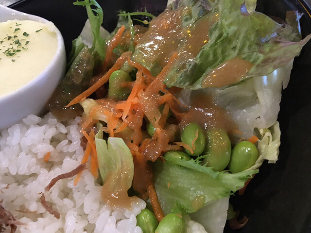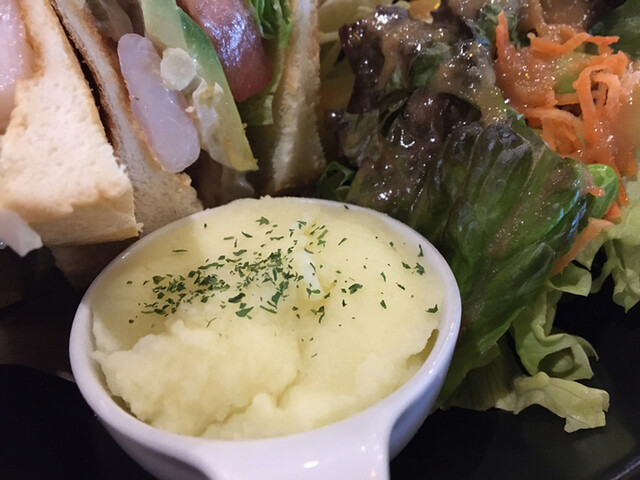 サンドウィッチは、アボガド、トマト、タマネギ、エビ、レタスが具材です。トーストされたパン(既に冷えています)に、具材を挟み、タルタルソースで味付けがされています。アボガドのトロりとした食感に、エビのプリプリ感が良いバランスです。エビはボイルされています。トマトも厚めにカットされて、そのまま挟まれていますので、ボリューム感は○です。他に、プレートにはサラダとマッシュドポテトが添えられています。サラダは、レタス、ニンジンの酢漬け、枝豆(?)、レンズ豆とお豆も入れられて、酸味の効いたドレッシングで味付けされています。酸味が効いて爽やかな美味しさです。ポテトは小さなカップに入れられています。温められていて滑らかな舌触りで美味しいです。