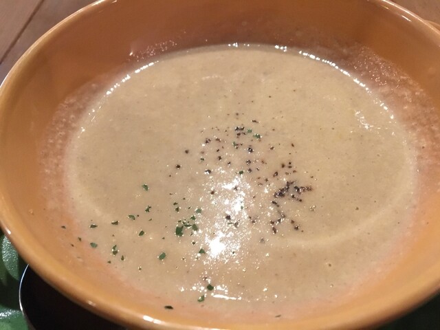 クラムチャウダーは、カップに入れられて運ばれてきます。具材は、アサリ、ベーコン、タマネギで、最後に乾燥パセリが振られています。タマネギは、角切りにされて食感が楽しく、アサリの出汁もしっかりと出ています。クリーミィな味わいでした。