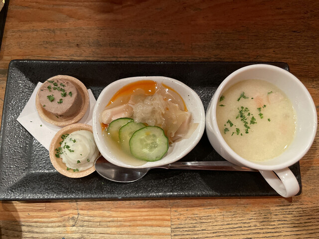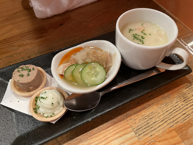 季節の3点盛り(コース内)評価=○:クラムチャウダー