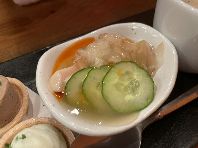 盛りの内容は、クラムチャウダー、ザーサイのピリ辛のあんかけ、ひとくちレバーパテ。クラムチャウダーは小さなカップに入ってあるけど、具沢山。人参やじゃがいもが細かくカットされて美味しいです。ピリ辛あんかけの具材は、ザーサイ、きゅうり、蒸し鶏でトロトロの出汁タレがかかっていて、このあんかけソースがとても美味しいです。パテはレバーとポテトサラダ。モナカの上にのせられてそのまま頂けます。