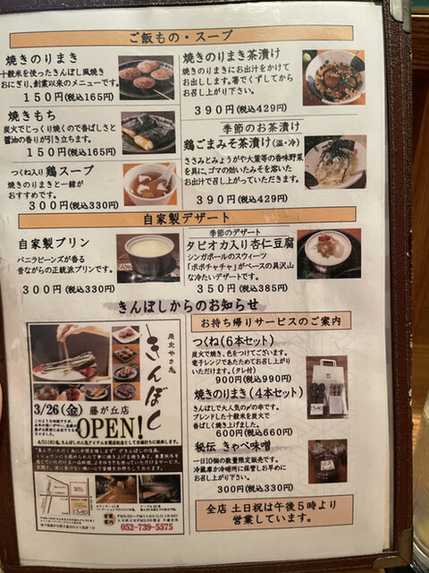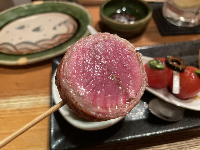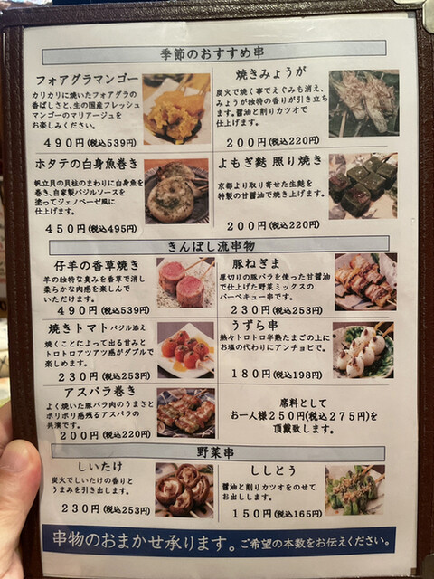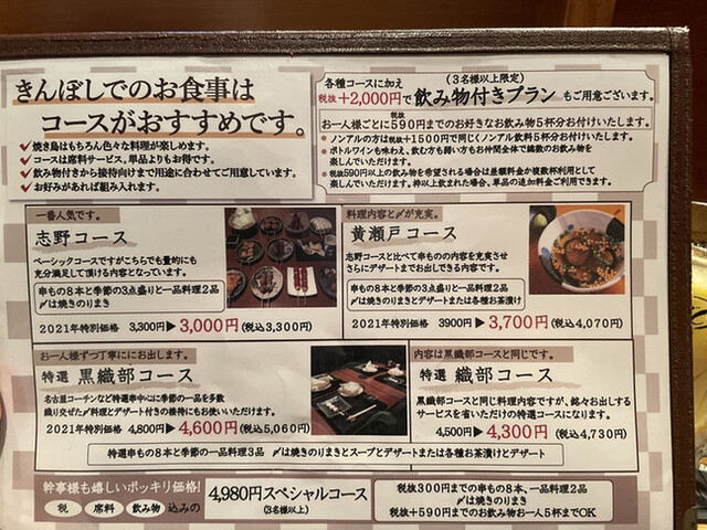 【コースの内容】串もの・・・つくね、きんぼし焼き、ねぎま、仔羊の香草焼き、長芋、アスパラ、心臓、うずら、のりまき。一品料理等・・・季節の3点盛り、手羽先唐揚げ、カニとホタテのキッシュ、焼きカマンベールチーズ