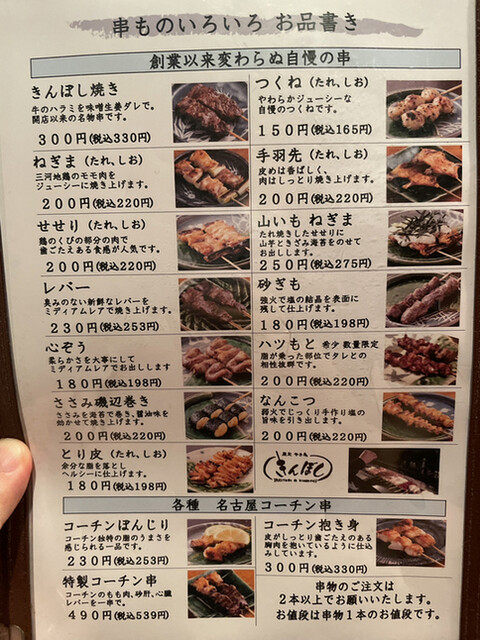 きんぼし焼き、つくね、手羽先、子羊の香草焼き、心臓、アスパラ巻き、やげんなんこつ、うずら、季節の一品3点盛り、一品料理の3点盛り