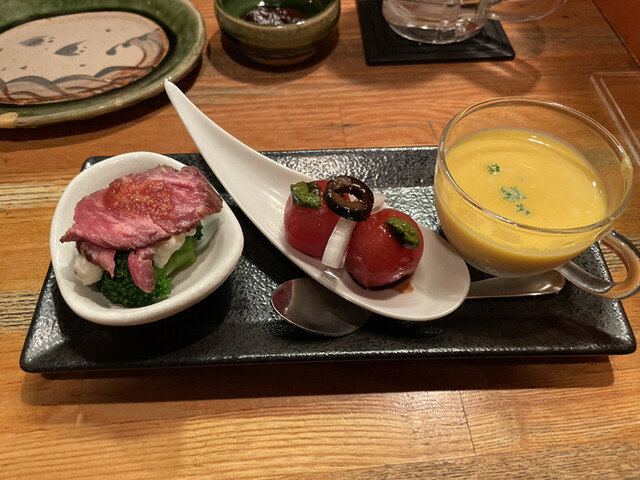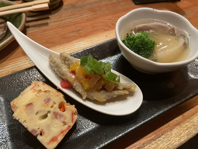 志野コース(税込 3,410円)評価=◎:3点盛り(オムレツ(?)、ワカサギのエスカベッシュ、大根と豚肉の煮物)
