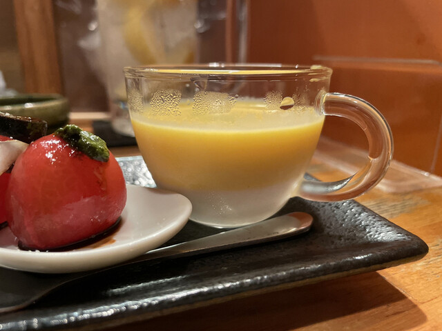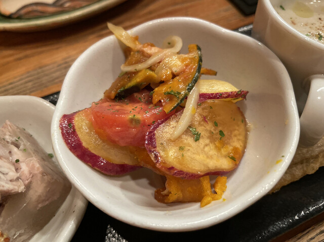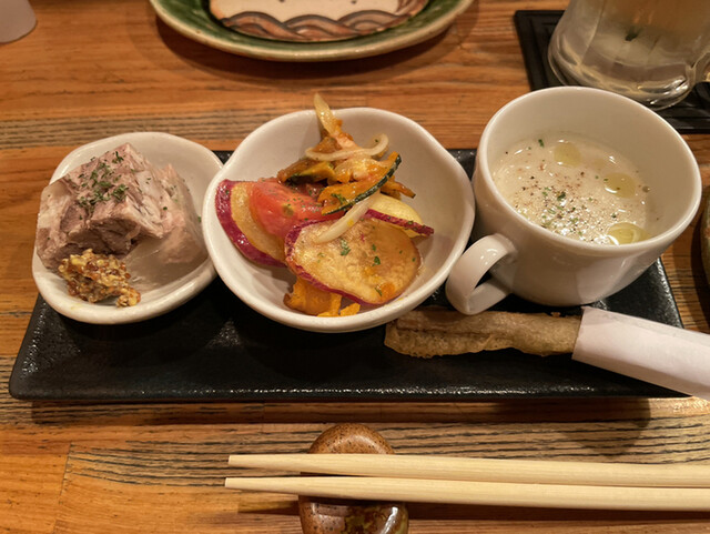 煮凝りは脂が美味しい。豚肉の塊とゼリーのような脂が口の中でトロけ混ざり美味しい。粒マスタードをつけて頂きます。南蛮漬けはさつまいの硬めの食感がいい。カボチャの甘味も加わりデザートのような仕上がりです。具材はトマト、さつまいも、カボチャ、ベーコン。牛蒡のポタージュは、牛蒡フリット付きです。牛蒡のフリットはサクサクの衣と牛蒡の香りが良い。ポタージュ自体は滑らかでこちらも牛蒡の香りが嬉しい。