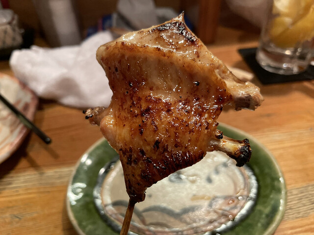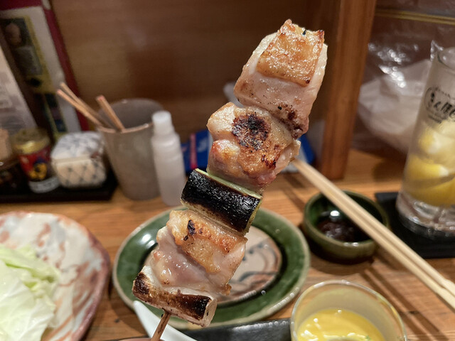 ギュッとしまった鶏肉です。締まっていますが、驚くほどのジューシーさで肉汁が溢れてきます。また、所々にコリコリの部分が食感アクセントになり、たまらなく美味しい。串の最後にネギがあり、それも口を引き締めとても良い。
