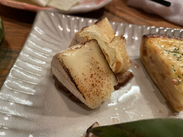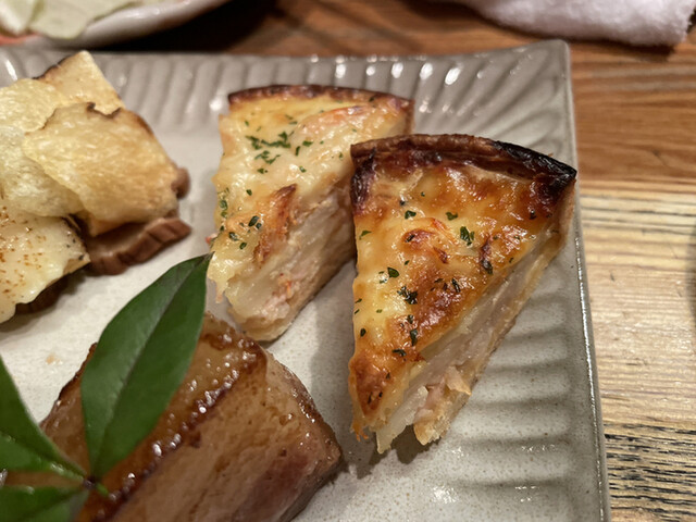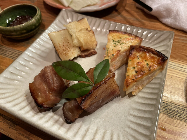 サクラチップで燻製されて運ばれて来ます。ガラスの器を開けて頂くと燻製の煙が広がり、良い香りが漂います。上からカマンベールチーズとクラッカーといぶりがっこの順で重ねられており、それぞれの食感が混ざり合ってシナジーが生まれているところが嬉しいです。