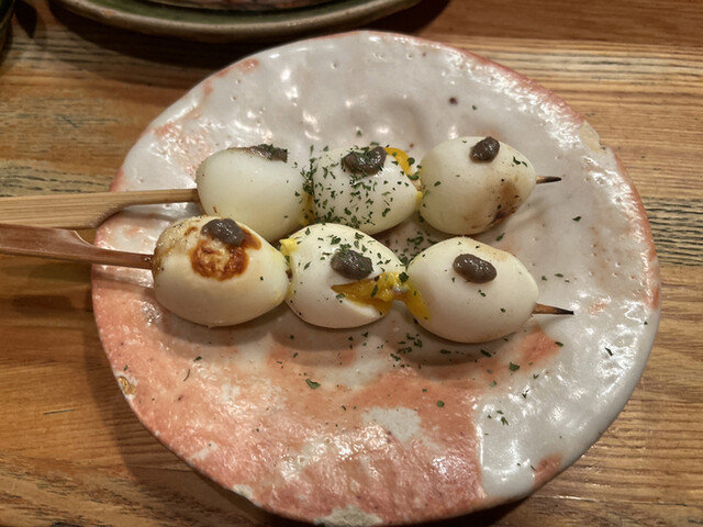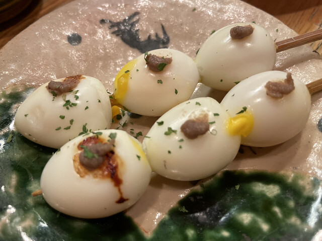 うずらの玉子が3つ並び、上にアンチョビがのせられています。うずらの玉子は半熟で、頂くたびに黄身が溢れてきます。味付けは同じく塩で、黄身と混ざり合って滑らかで濃厚な美味しさになります。アンチョビが独特の塩味と香り、旨みを加えて美味しいです。
