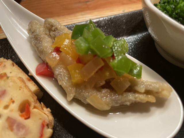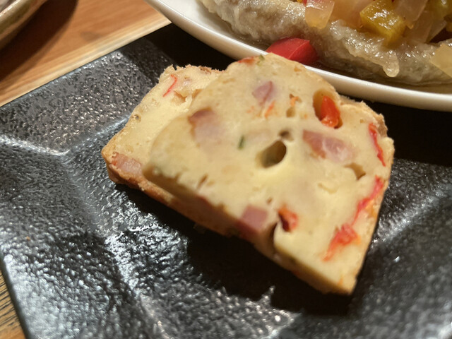一皿に三品がのせられて運ばれます。向かって左からオムレツ(?)、ワカサギのエスカベッシュ、大根と豚肉の煮物です。オムレツは人参等ダイスカットされた野菜が沢山で食感も面白い。ワカサギのエスカベッシュはワカサギのから揚げに甘酢のタレが染み込んで美味しい。煮物はバター(?)か何か美味しい脂がたっぷりで肉の旨味が全体に広がり美味しい。