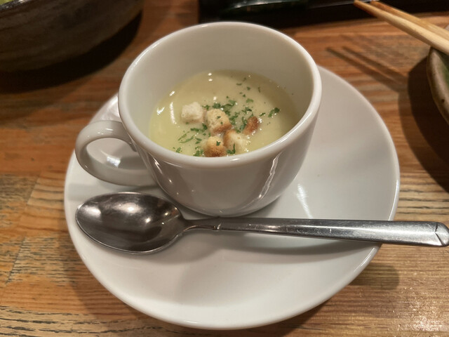 志野コース(税込 3,410円)評価=◎:白菜と太ネギのポタージュ(無料サービス)