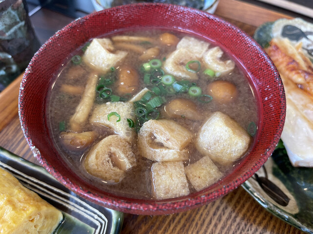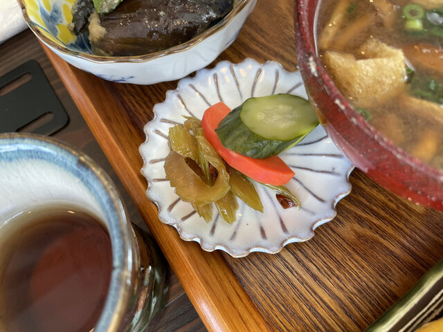 【ご飯・味噌汁・漬物】おかずが美味しいのでご飯の美味しさが更に引き立ちます。柔らか過ぎず、硬過ぎず、べたつかずの丁度の仕上がりでした。粒立ちも良い感じです。味噌汁も具沢山です。表面一杯の揚げと青ネギ、豆腐としめじでお椀の中がぎっしりです。漬物はセロリ(?)のザーサイ風とキュウリと人参の浅漬け。どれもさっぱりとした味付けで食感が嬉しい美味しさでした。