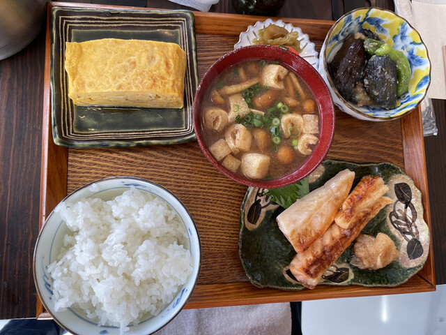 主菜:ノルウェー産 サーモンハラス塩焼き、副菜:魚河岸の厚焼き玉子、茄子の胡麻味噌よごし