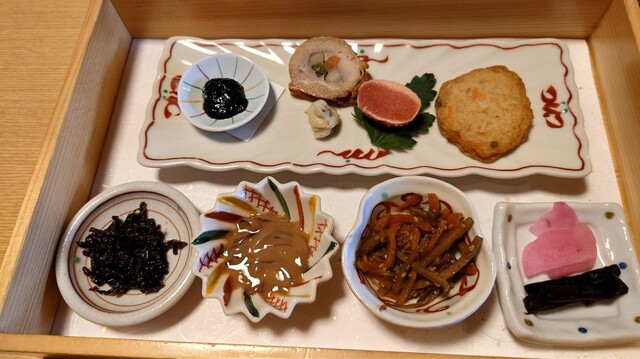 前菜は7種類が少しずつだが、どれも手が込んでいて美味しい。舌鼓を打っていると、再び仲居さんが入室して、鮑を殻から外して切ってくれる。肝を召し上がりますかと聞かれたので、もちろんと回答。食べない人もいるらしい。もったいない。酒蒸しの鮑はとても柔らかくて香りもよく、言うことなしだ。バターとちょっぴりの醤油が味をさらに引き立てる。