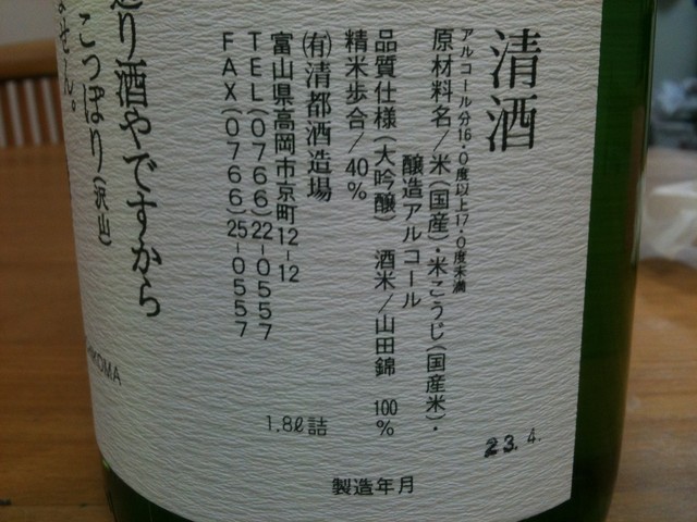 【清都酒造所・富山県高岡市】 勝駒 大吟醸 (2011/04/23)