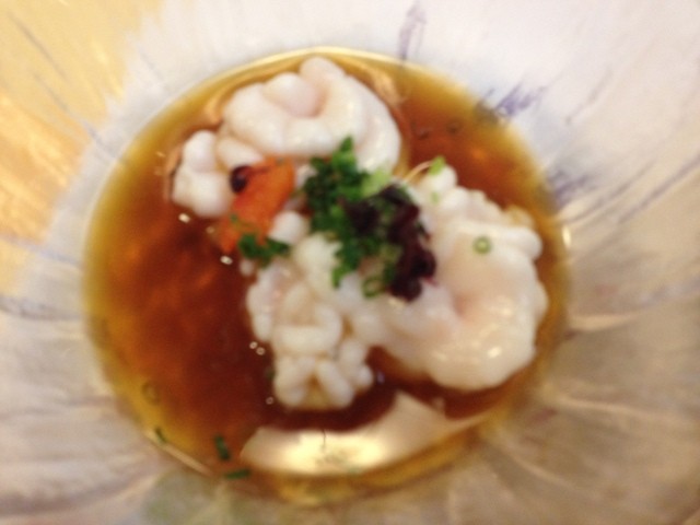 ・海老のアヒージョ。ニンニクの香り鮮烈。香ばしい殻もいただく。良いですね。