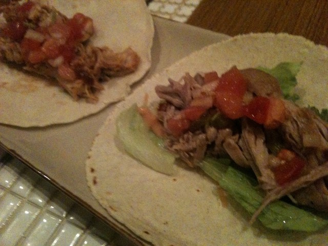 ・塩豚タコスと鶏肉タコス。タコスは1枚ずつ焼く。小麦の香りがイイ!具材もたっぷり。