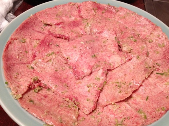 薄切りのタン元。塩ダレ。これは旨い!さっくりした歯応えとサシのとろける感じが絶妙。