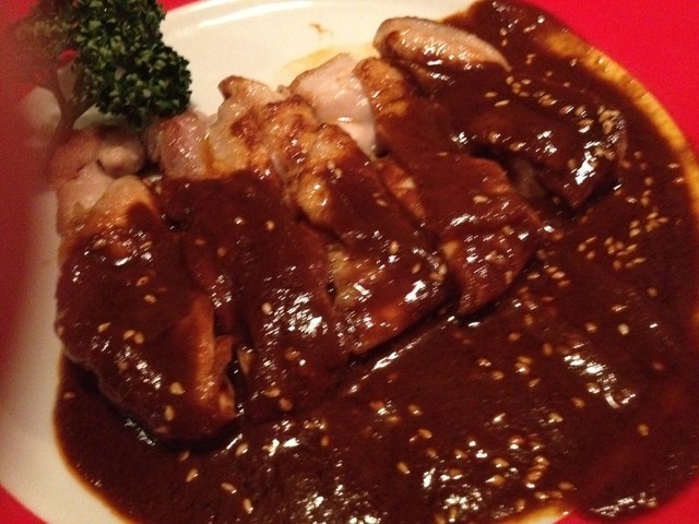 若鶏のモーレソース。甘い風味の後から来る苦み。面白いです。胡麻風味が効いてます。
