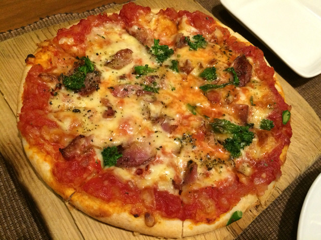 そしてピザ。やや薄めの生地でパリパリタイプ。ローマ風ほどではないですが。フレッシュなトマトソース、とろとろのチーズ、薄くスライスされたソーセージ。なかなかバランスいいですね。