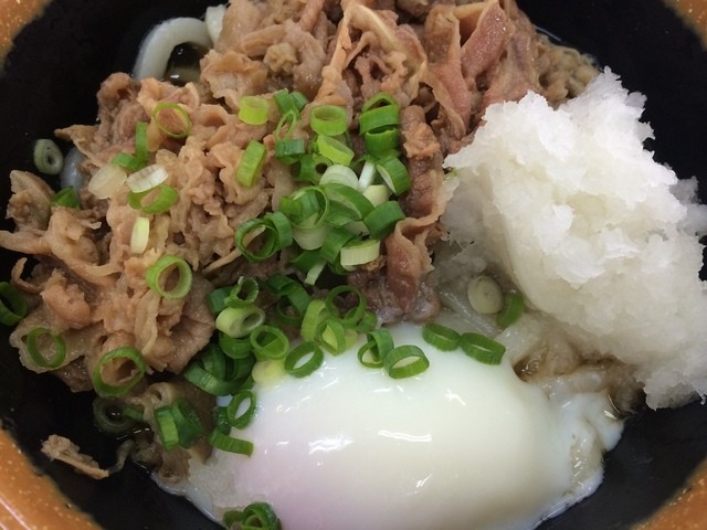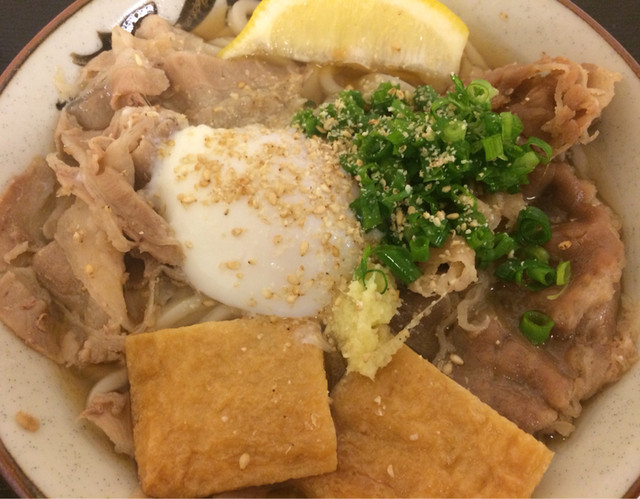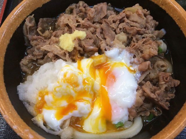 牛肉豚肉お揚げに温玉。オールスターぶっかけですね。