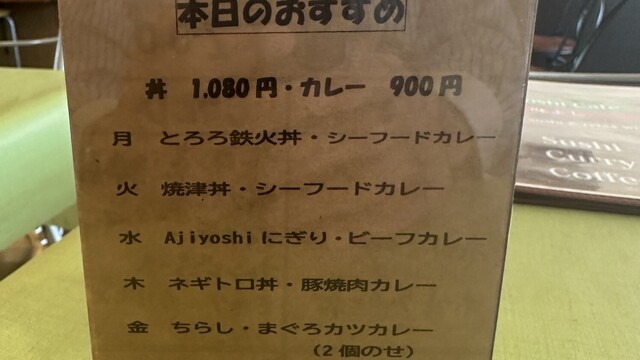平日12時過ぎ。ほぼ満席。当然限定まぐろ丼は終了。ならば、ジョーカー登場、シーフードカレーを。