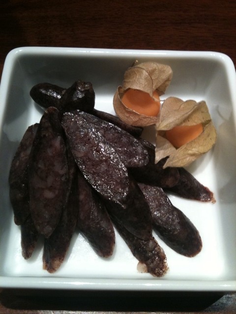 自家製腸詰800円。癖のない味。食用ほおずきが添えられる。フルーティーで美味しい。