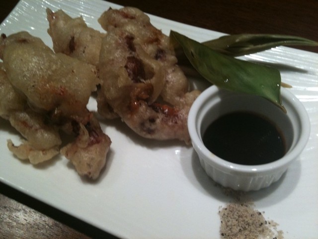 生ホタルイカのフリット800円。腸のほろにがが美味しい。塩とタレ。食用かたくりが敷かれている。これまた美味しい。