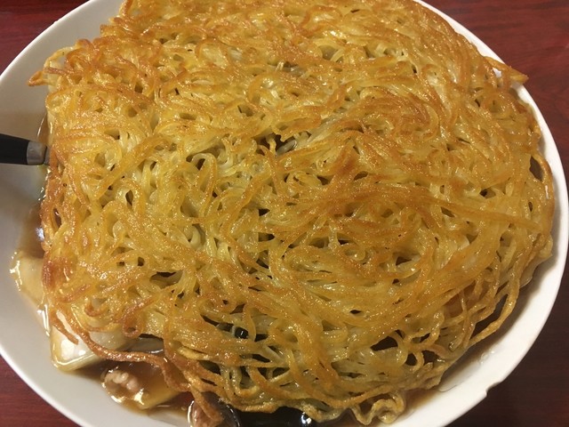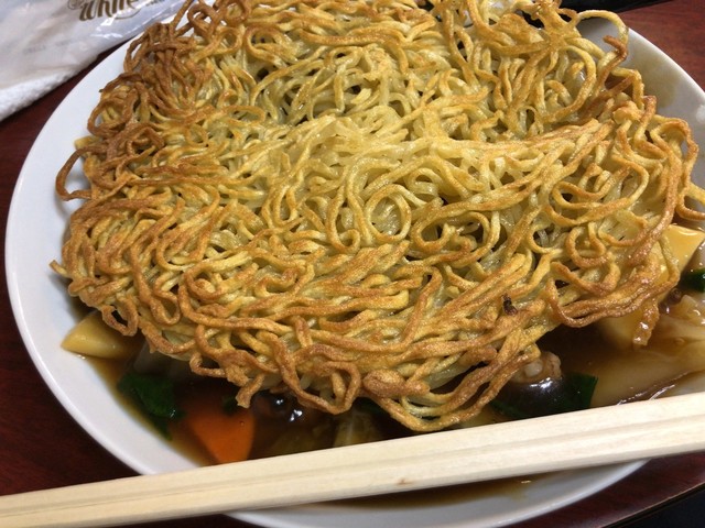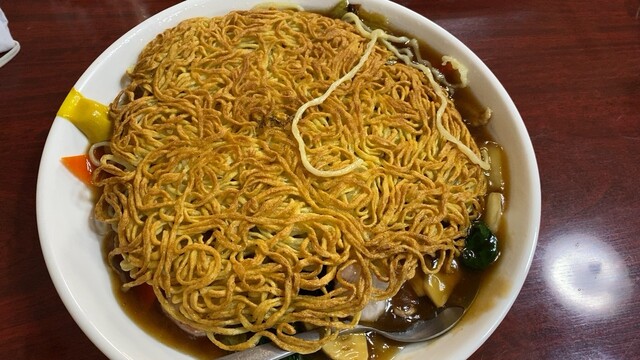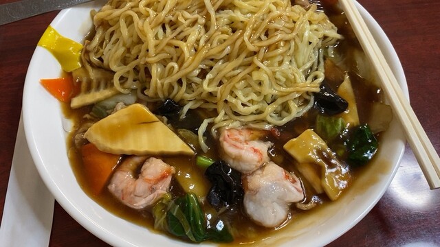 平らに焼かれた焼きそばの下に濃厚な餡かけ。白菜海老豚肉など具沢山。汁気多めの餡かけでパリパリ焼きそばが徐々にしっとり。食感も楽しい。これ好きw