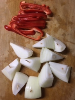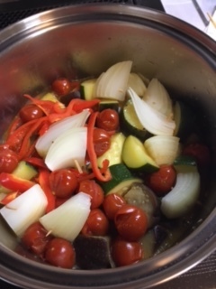次に赤ピーマン、ルビートマト、玉ねぎを投入したら、フライパンを振って軽く混ぜるぐらいにして放って置きます。オイルが足らない時は少し足してください。野菜から水分が出てきますので水は加える必要がありませんが、100ccぐらいの白ワインと大さじ一杯のバルサミコ酢を加えてれば完成です。超簡単!