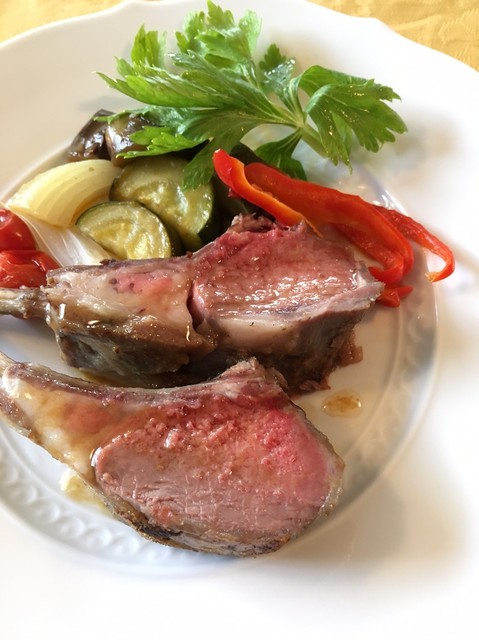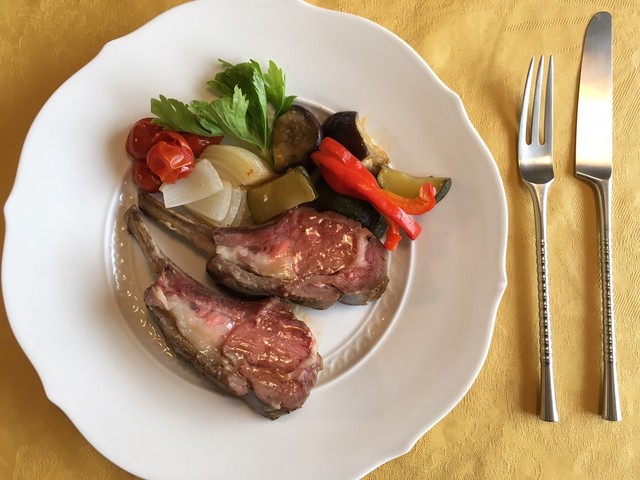 適当に盛り付けて、トスカーナの赤ワインMAZZEI BELGVARDO BRONZONE RISERVA 2012、サンジョベーゼ種を飲みながらいただきました。凄く美味しい!抑えられた酸味と軽やかな苦味のバランスが良く、ラム肉にピッタリの赤ワインでした。